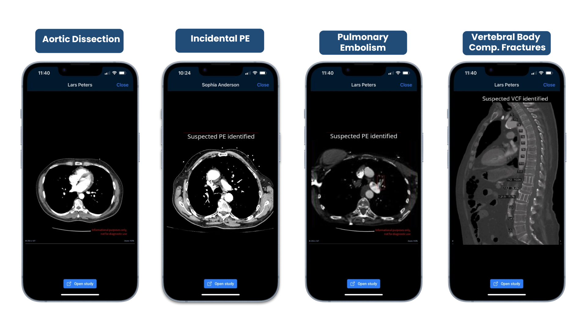 - Incidental Pulmonary Embolism: iPE is a radiological computer-aided triage and notification software designed for the analysis of chest CT angiography. Using an advanced artificial intelligence algorithm, CINA-iPE analyzes images, flags incidental pulmonary embolisms, and notifies the care team. (Sensitivity: 87.8%; Specificity: 92%; Accuracy: 90%)